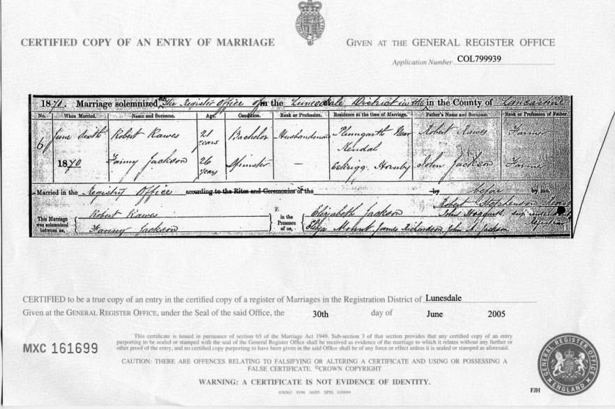 | Marriage | 1870 | Robert Rawes & Fanny Jackson, Lunesdale, Lancs | Plumgarths | C00046 |