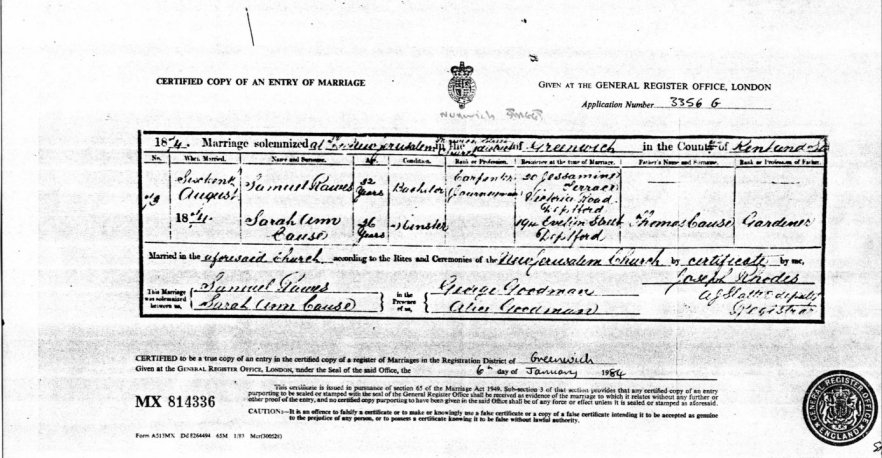 | Marriage | 1874 | Samuel Rawes & Sarah Ann Cause, Greenwich, Kent | Synague | C00047 |
