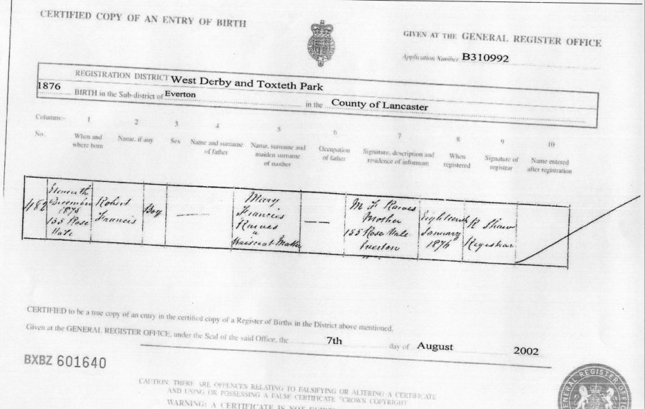 | Birth | 1896 | William Rawse, West Derby, Lancs | McSally | C00105 |