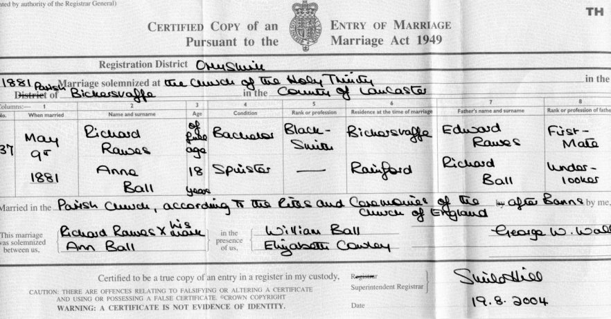 | Marriage | 1881 | Richard Rawes & Ann Ball, Bickerstaffe, Lancs | Bickerstaffe | C00050 |
