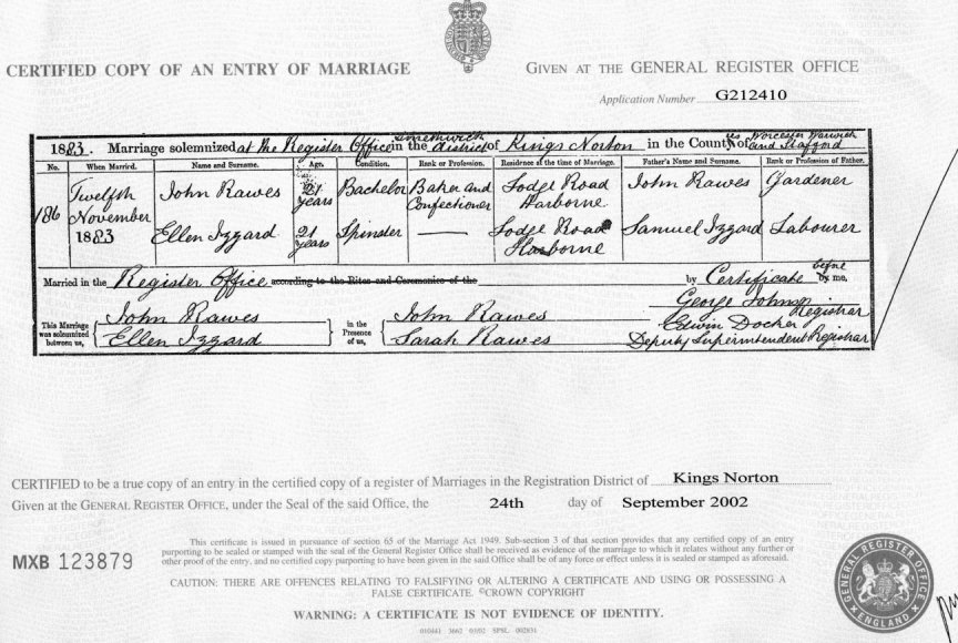 | Marriage | 1883 | John Rawes & Ellen Izzard, Kings Norton | n/r | C00051 |