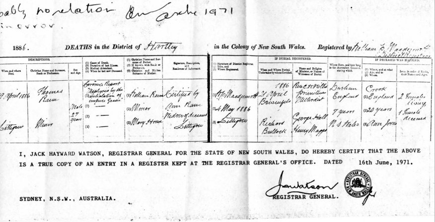| Death | 1886 | Thomas Rawe, New South Wales, Australia | Toulmin | C00054 |