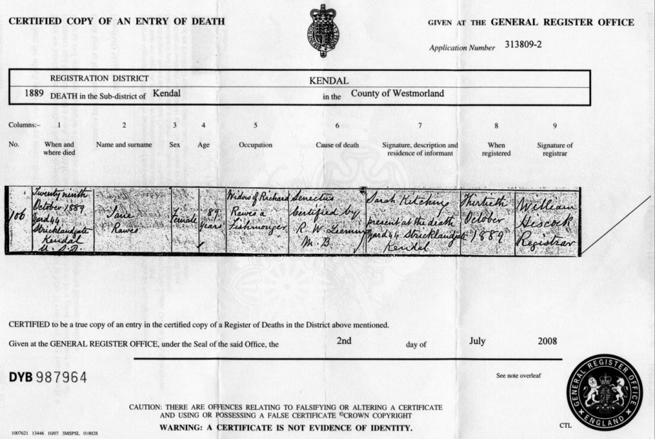 | Death | 1889 | Jane Rawes, Kendal | Fishmonger | C00055 |