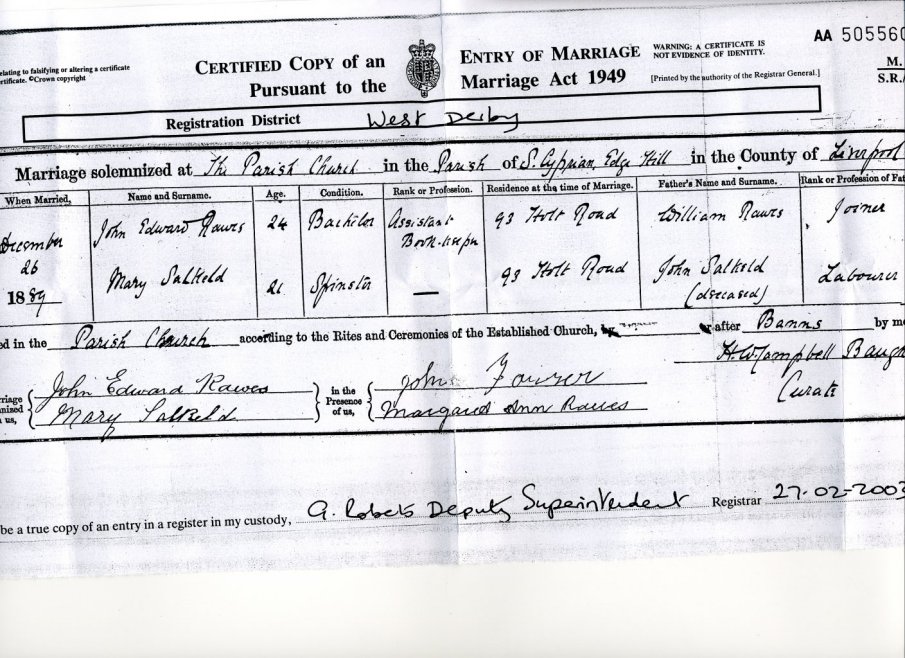 | Marriage | 1889 | John Edward Rawes & Mary Salkeld, West Derby, Lancs | McSally | C00056 |