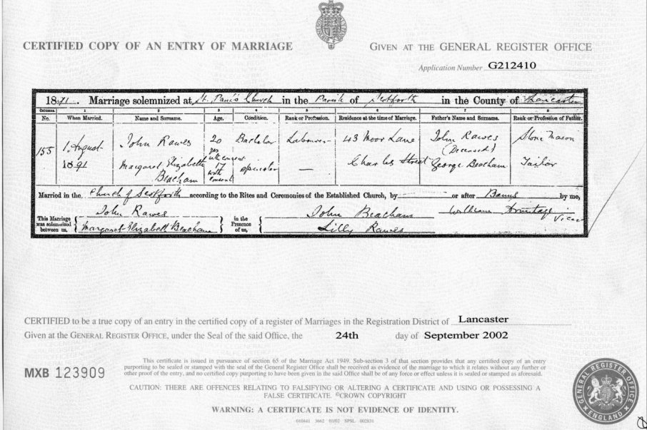 | Marriage | 1891 | John Rawes & Margaret Elizabeth Beacham, Scotforth, Lancs | Census | C00057 |