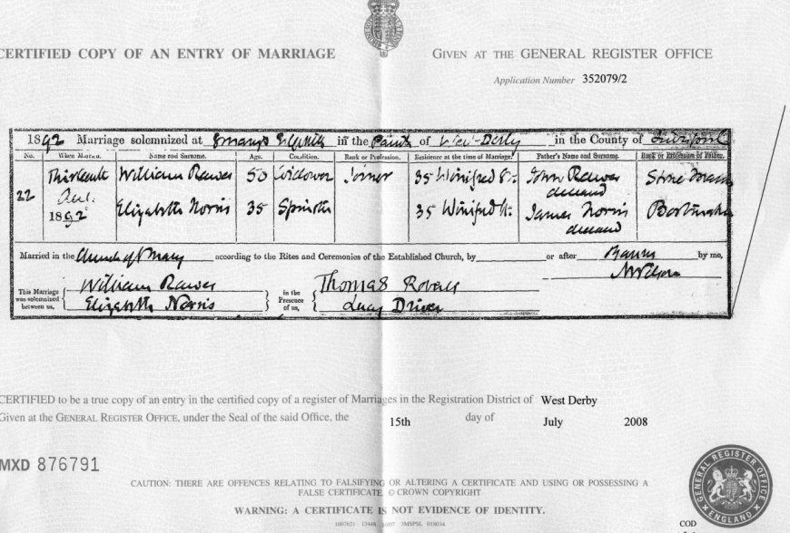 | Marriage | 1892 | William Rawes & Elizabeth Norris, West Derby, Lancs | West Derby | C00058 |