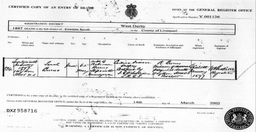 | Death | 1897 | Sarah Burns, née Rawes, Everton, Lancs | ? | C00059 |
