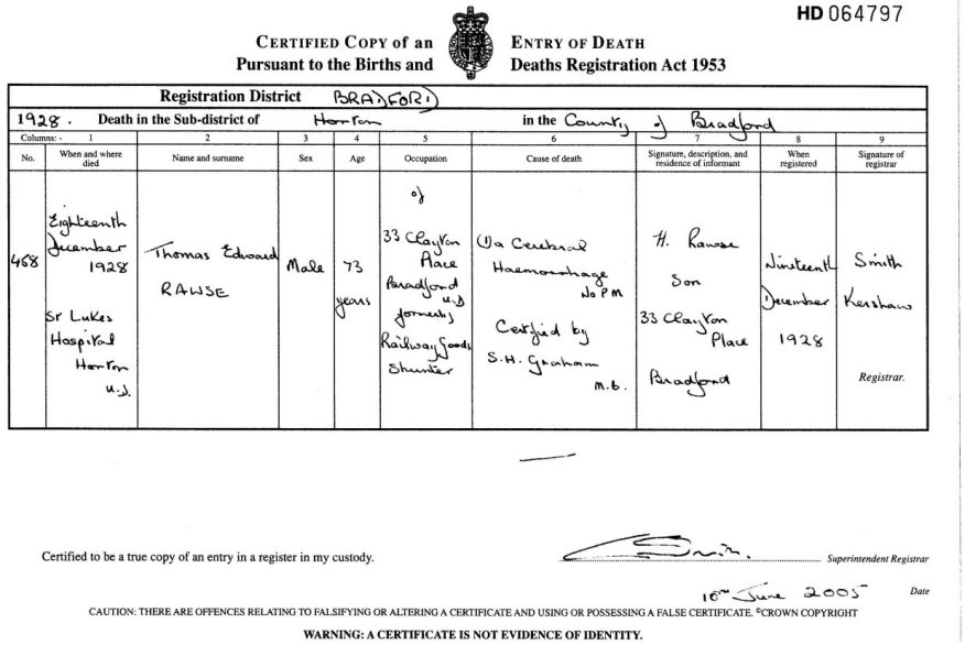 | Death | 1898 | John Rawse, Bradford, YKS | Spivey | C00061 |