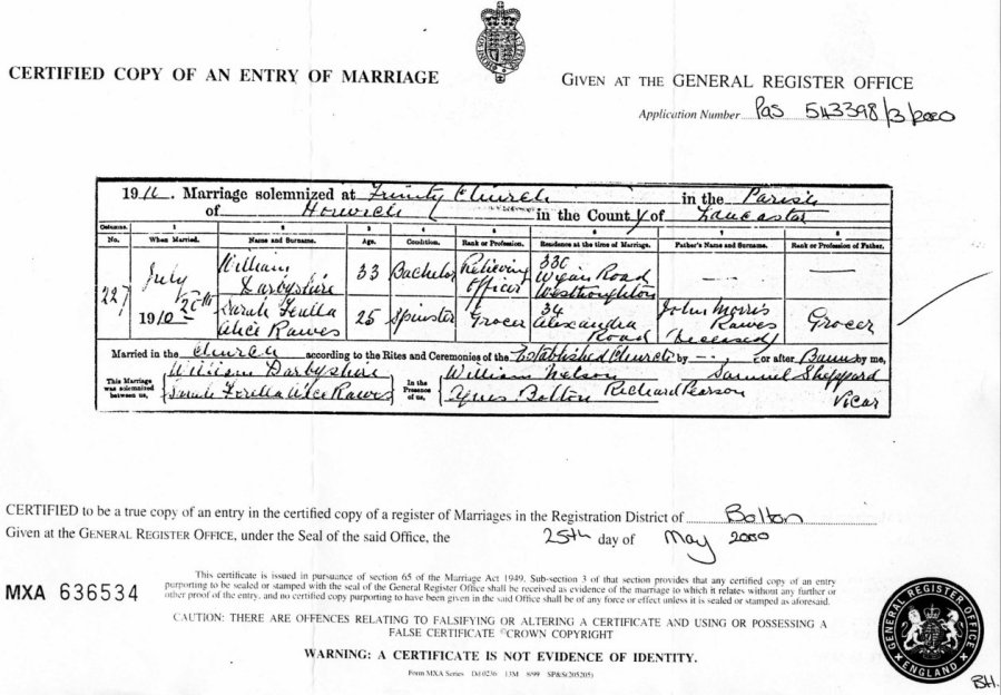 | Marriage | 1910 | William Darbyshire & Sarah Ferrela Alice Rawes, Horwich, Lancs | Morris | C00065 |