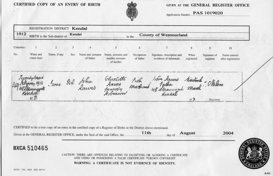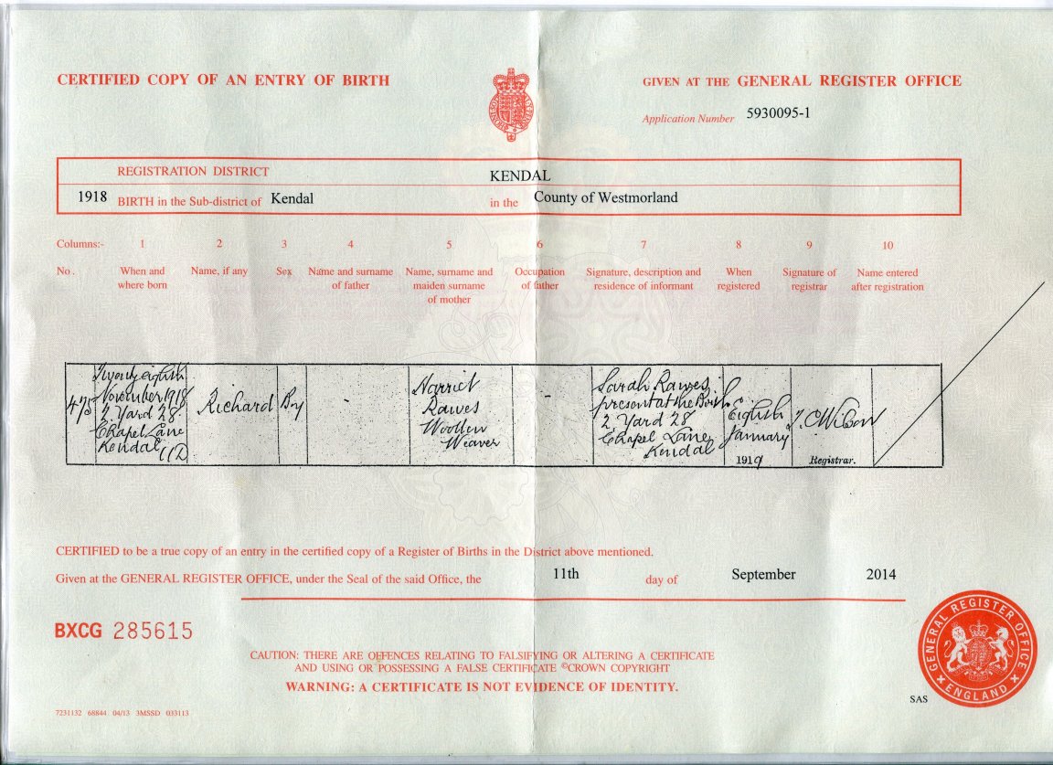| Birth | 1918 | Richard Rawes of Kendal | Kendal | C00091 |