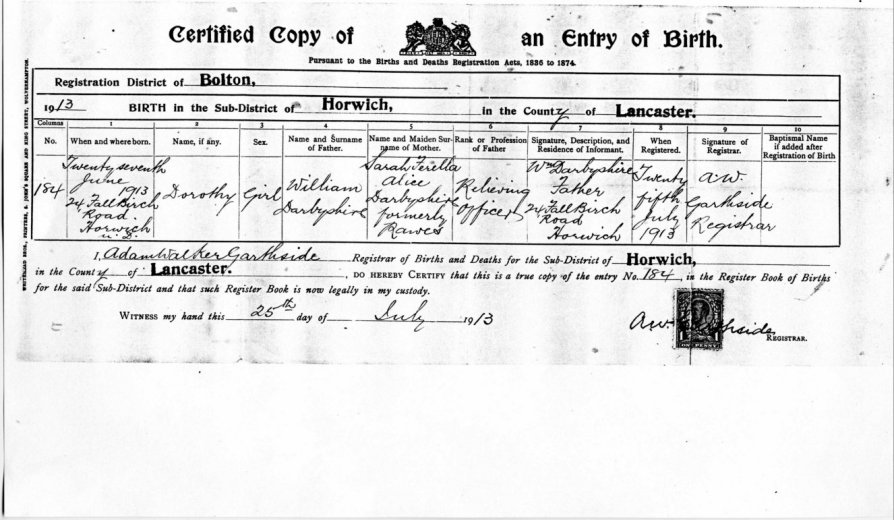 | Birth | 1913 | Dorothy Darbyshire, Horwich, Lancs | Morris | C00067 |