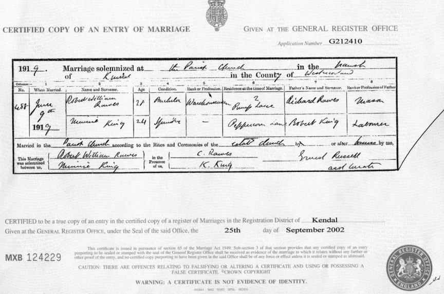 | Marriage | 1919 | Robert Wm Rawes & Minnie King, Kendal | Kendal | C00070 |
