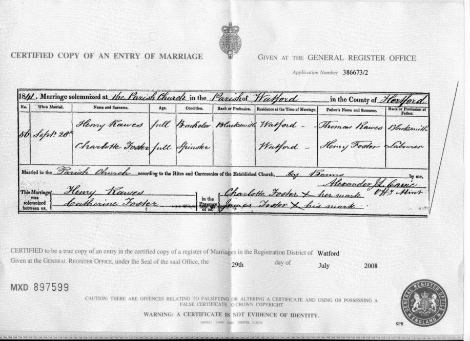 | Marriage | 1841 | Henry Rawes & Charlotte Foster, Watford, HRT | n/r | C00072 |