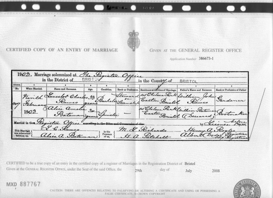 | Marriage | 1903 | Lancelot Charles Rawes & Alice Amelia Bateman, Bristol, GLS | Stavely | C00073 |