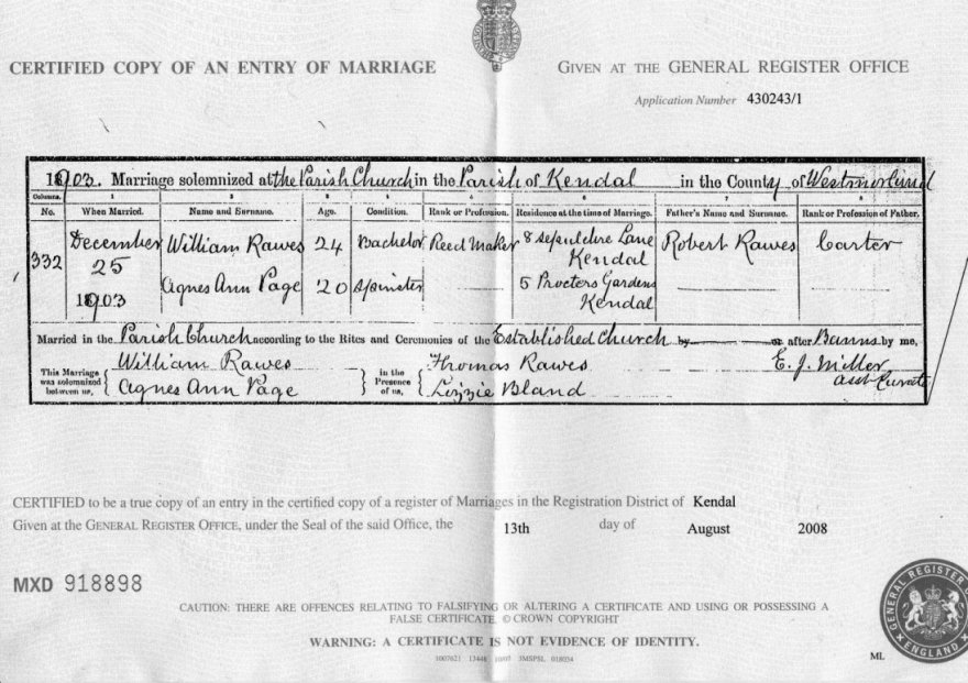| Marriage | 1903 | William Rawes & Agnes Ann Page, Kendal, WES | Haslingden | C00074 |