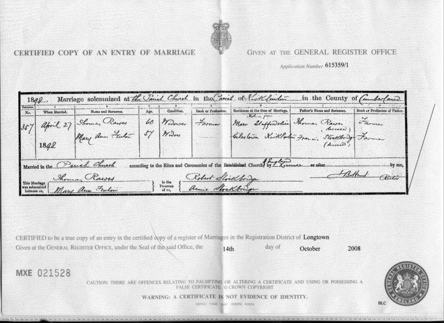| Marriage | 1898 | Thomas Rawes, Kirklinton, CUM | Coates | C00076 |