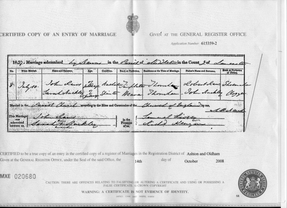 | Marriage | 1837 | John Raws & Sarah Buckley, Middleton, LAN | Shoemaker | C00077 |