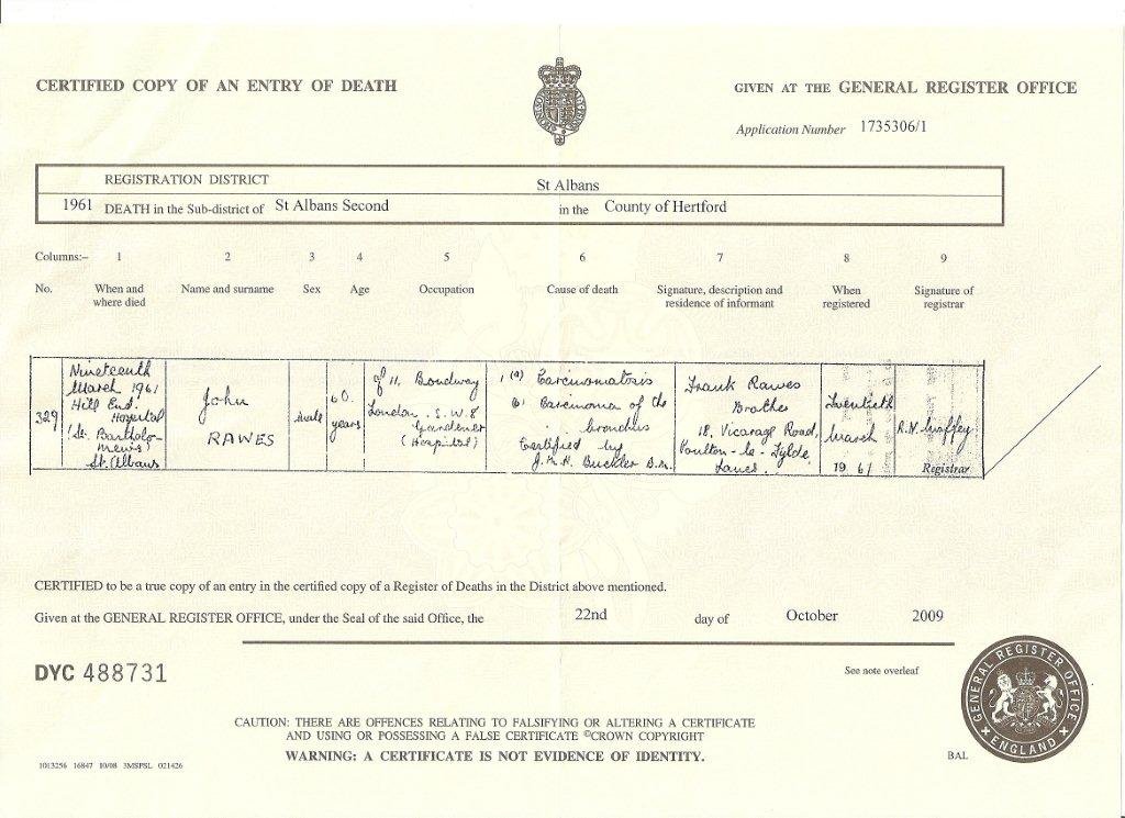 | Death | 1961 | John Rawes of London, died St. Albans | Jamaica | C00082 |