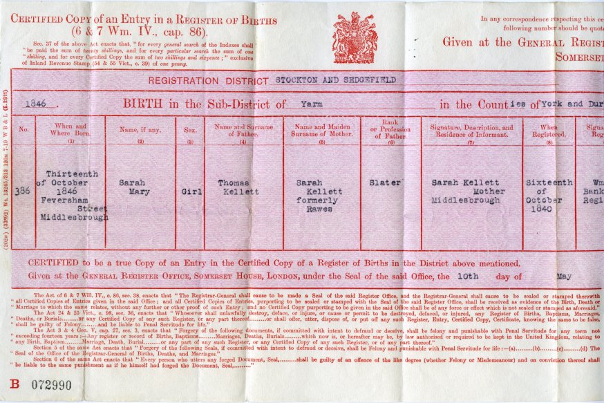 | Birth | 1846 | Sarah Mary Kellett, Middlesborough, Durham | Wm Wilson | C00083 |