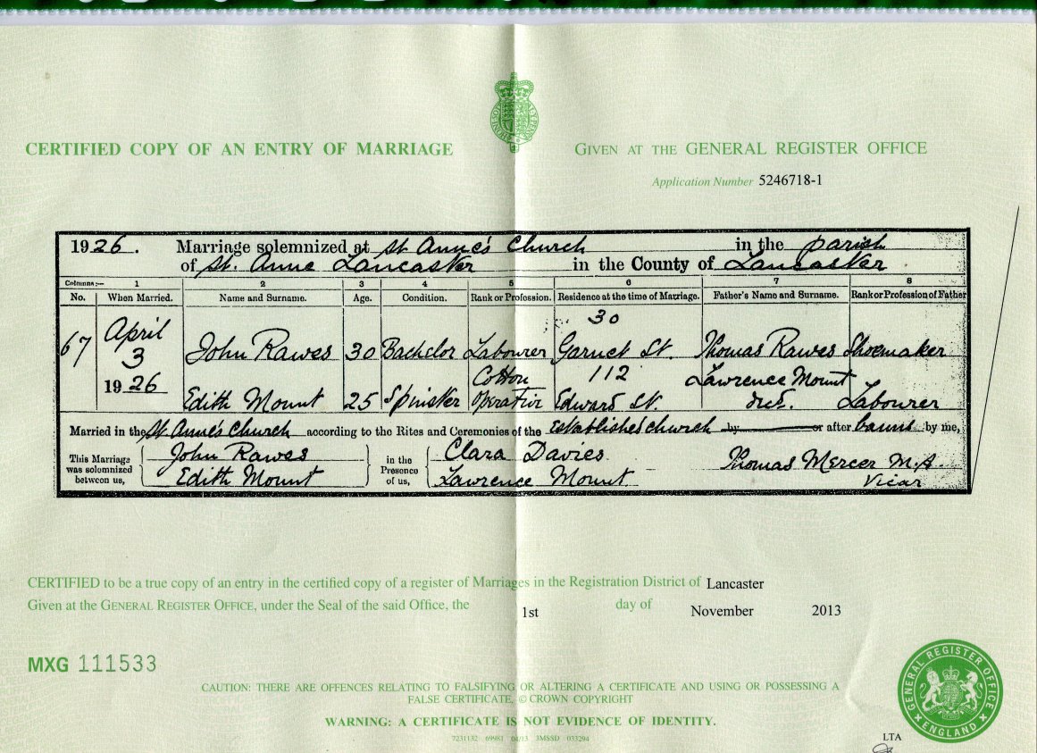 | Marriage | 1927 | John Rawes & Edith Mount, Lancaster | Joiner | C00086 |