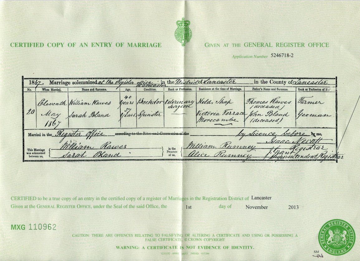 | Marriage | 1867 | William Rawes & Sarah Bland, Lancaster | Coates | C00087 |