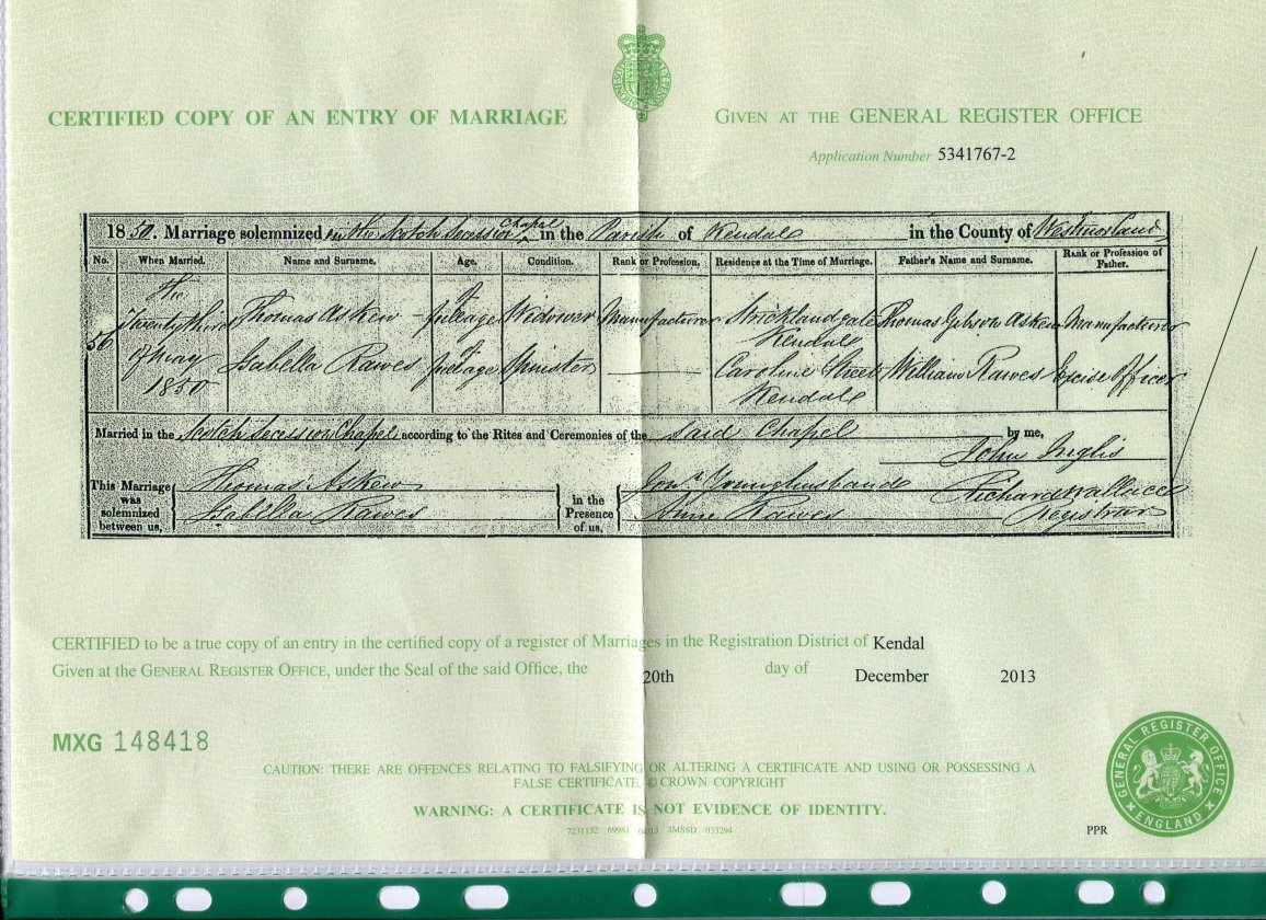| Marriage | 1854 | John Rawes, Kendal, Westmorland | Greenhow | C00022 |