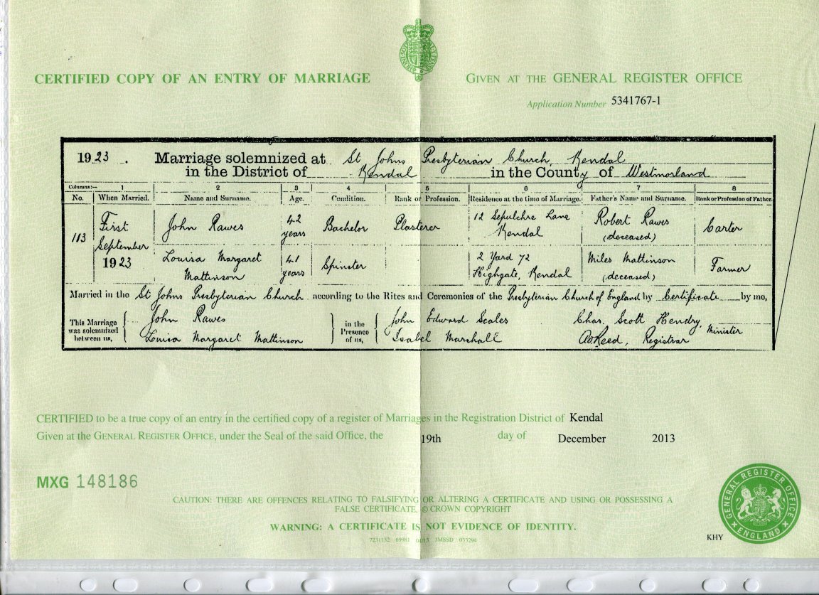 | Marriage | 1923 | John Rawes & Louisa Margaret Mattinson, Kendal | Kendal | C00089 |