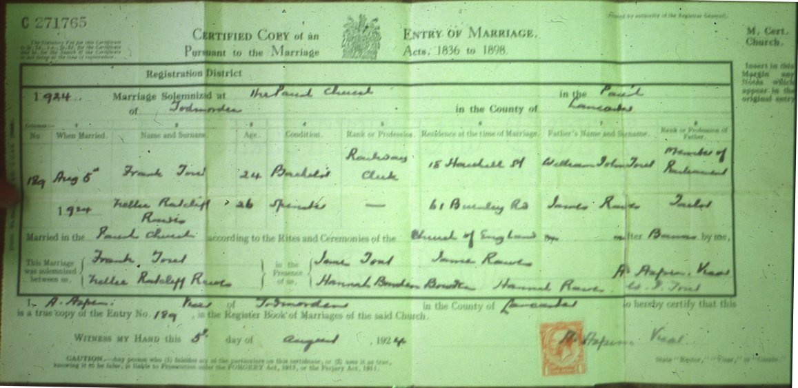 | Marriage | 1924 | Nellie R Rawes & Frank Tout of Todmorden, Lancs | Ratcliff | C00090 |