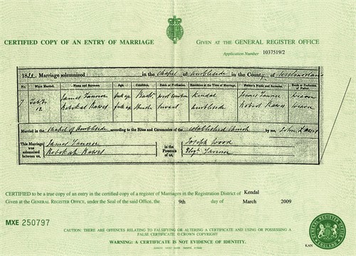 | Marriage | 1859 | Rebecca Rawes, Kendal, Westmorland | Kendal | C00115 |