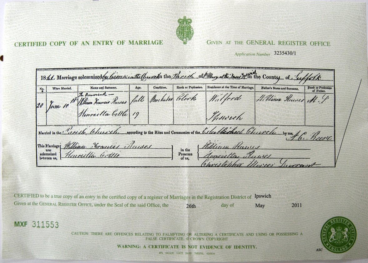 | Marriage | 1841 | William Francis Rawes & Henrietta Cottle, Ipswich, Essex | Russell | C00094 |