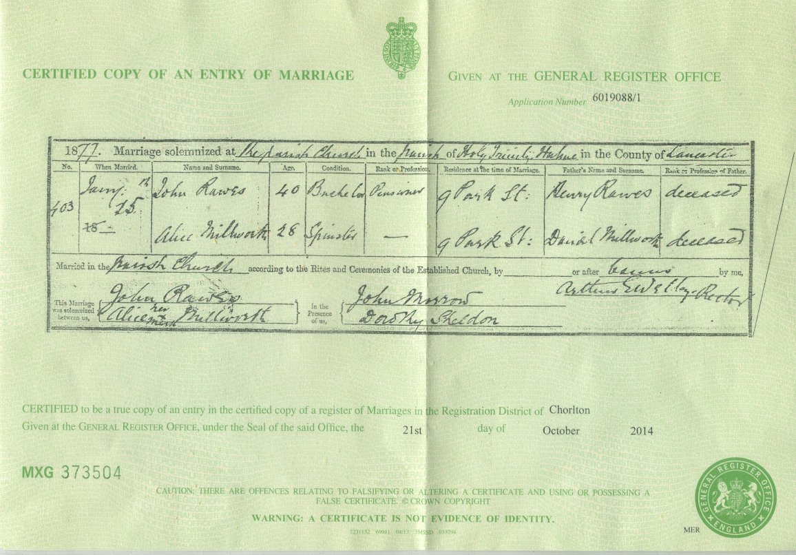 | Marriage | 1877 | John Rawes of Hulme, Lancs | Lord | C00098 |