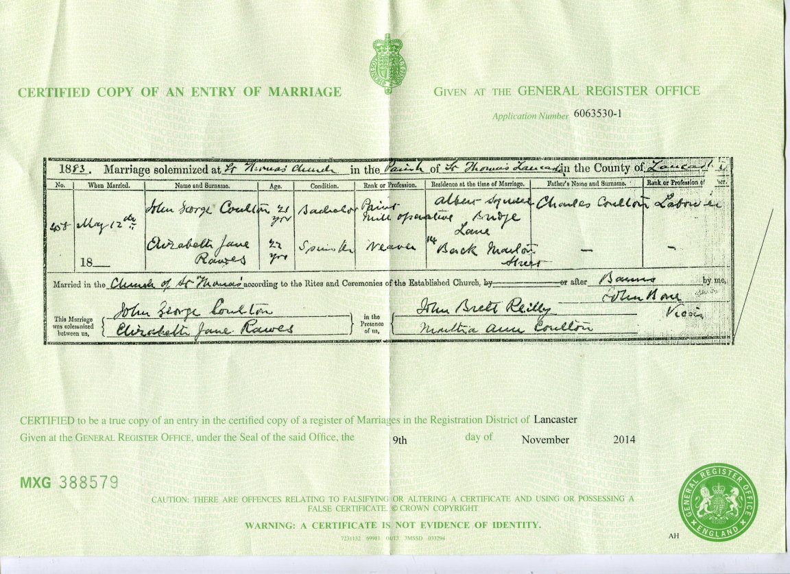 | Marriage | 1883 | Elizabeth Jane & John George Coulton, Lancaster | Cartmel | C00100 |