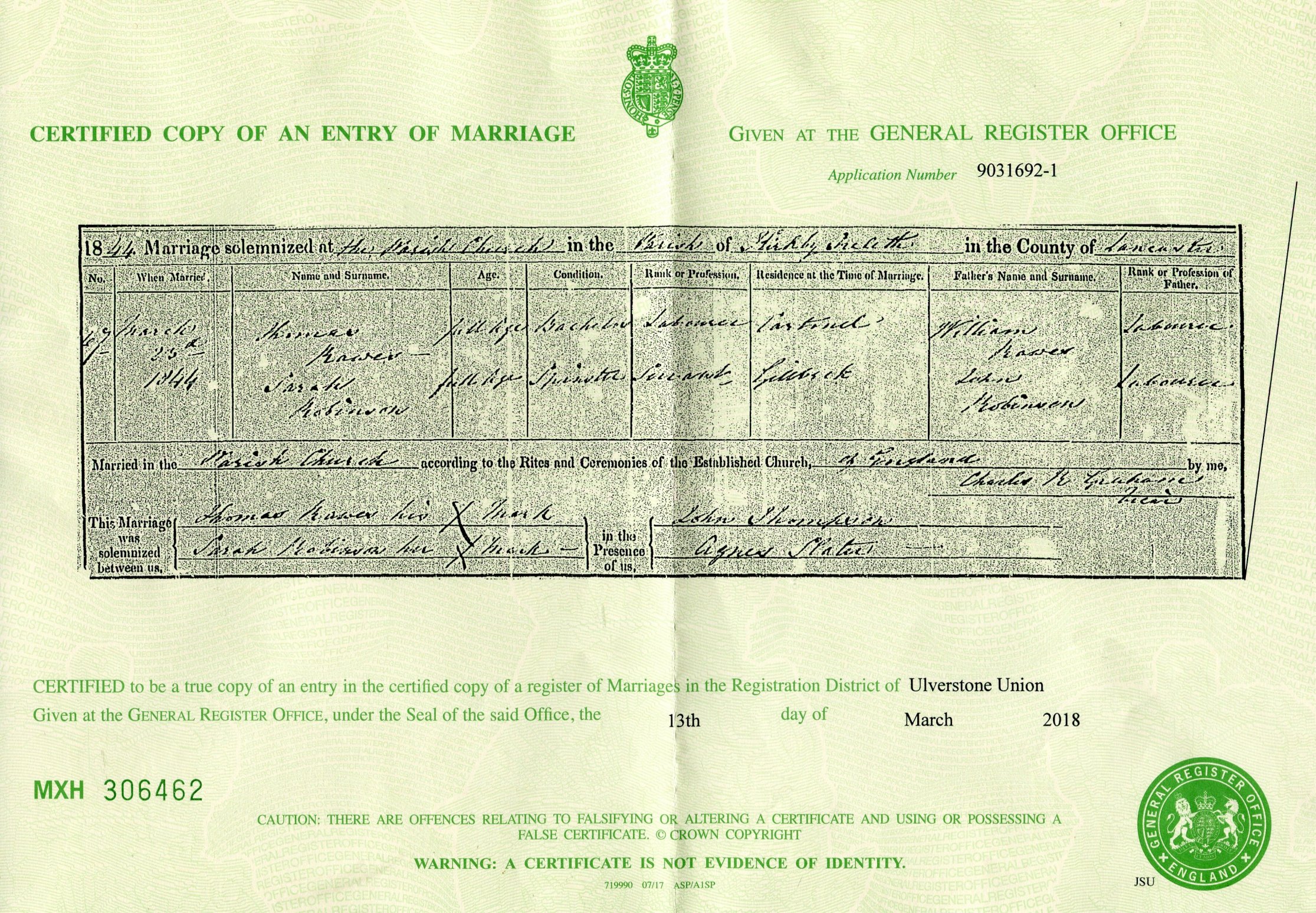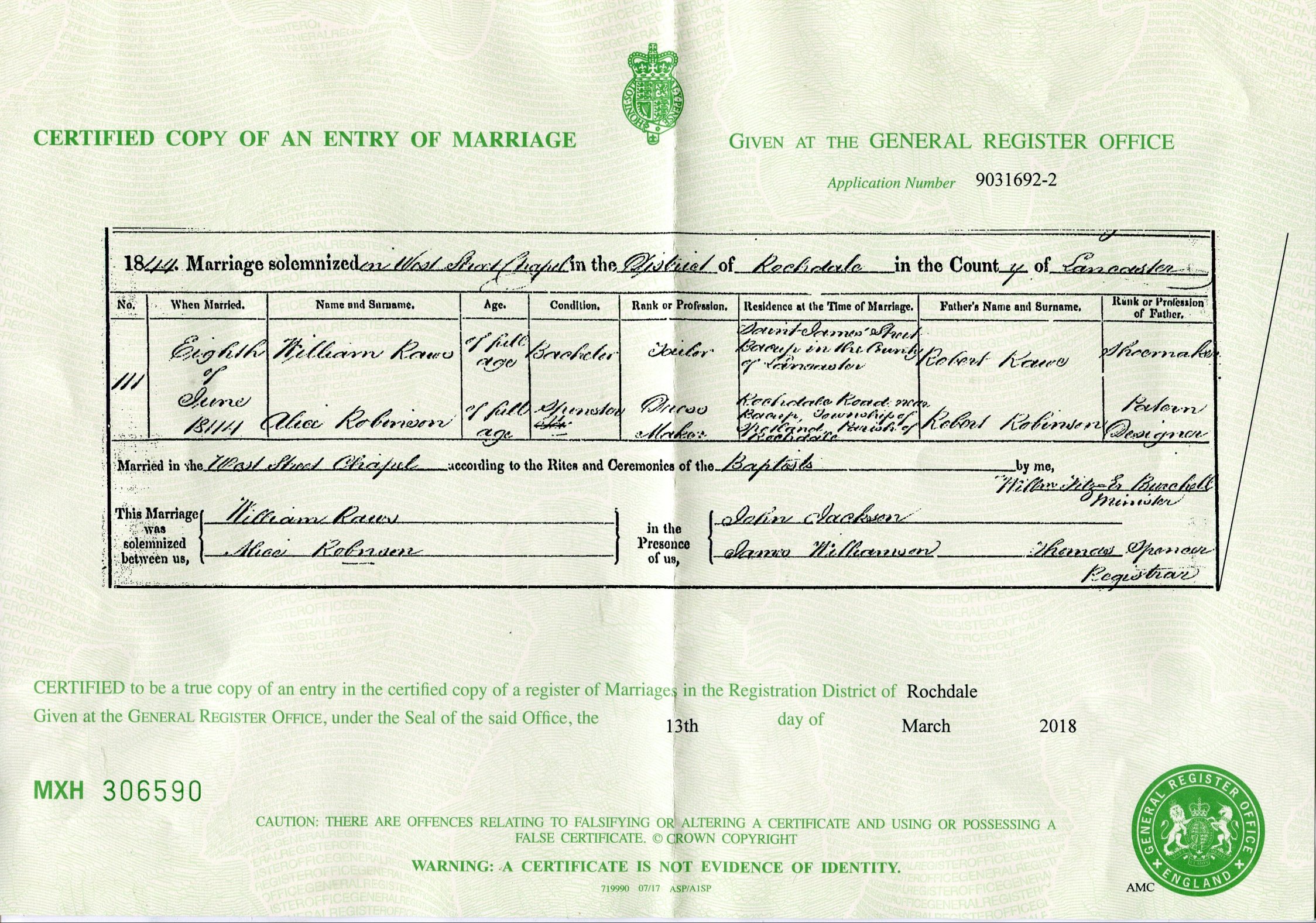 | Marrige | 1844 | William Raws, Rochdale, Lancs | Raws | C00102 |