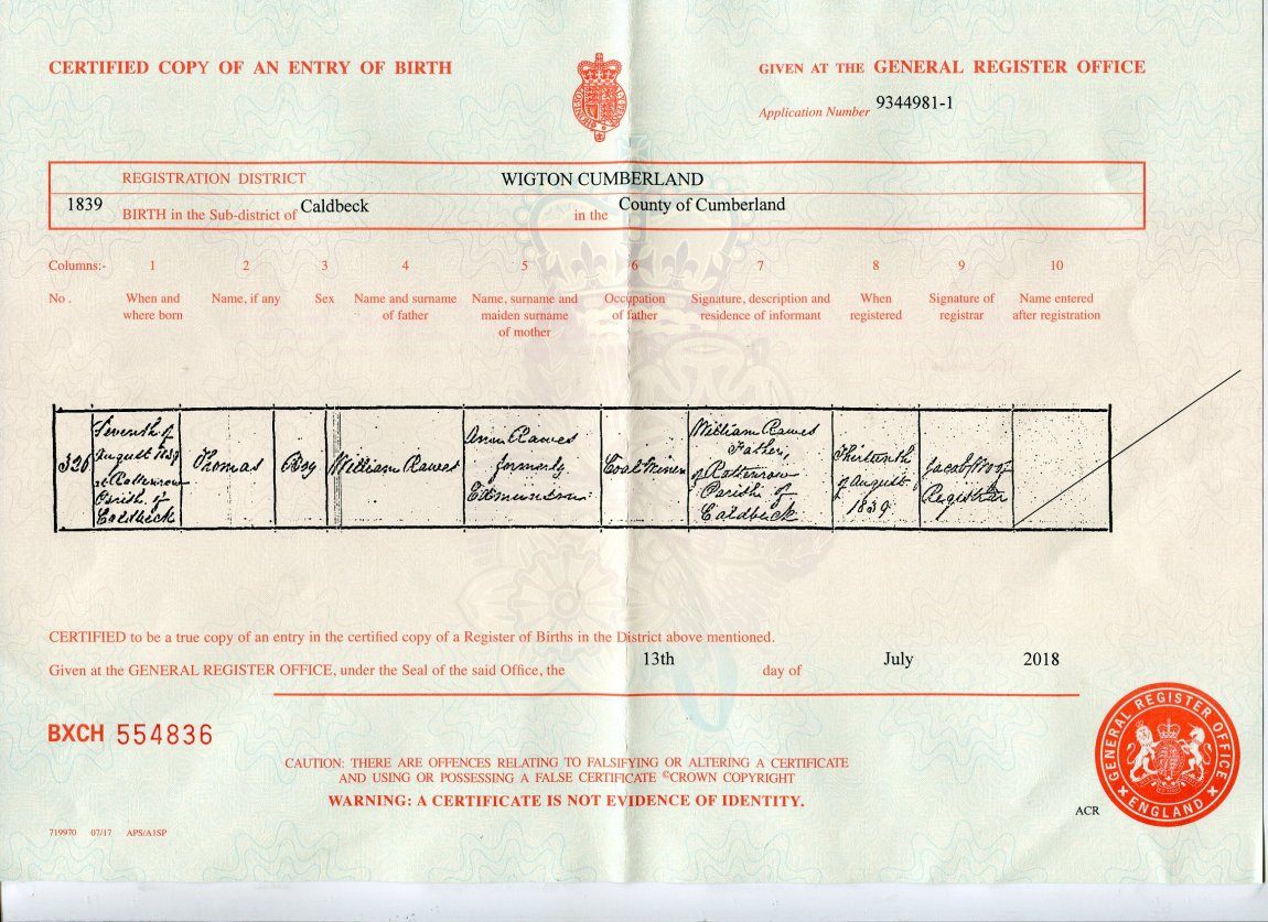 | Birth | 1839 | Thomas Rawes, Caldbeck, Cumberland | Anthony | C00106 |