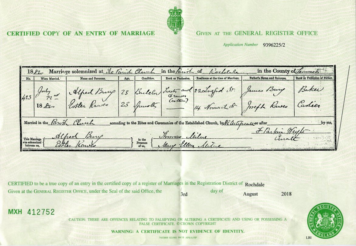 | Marriage | 1882 | Esther Rawes & Alfred Bury, Rochdale, Lancashire | n/r | C00108 |