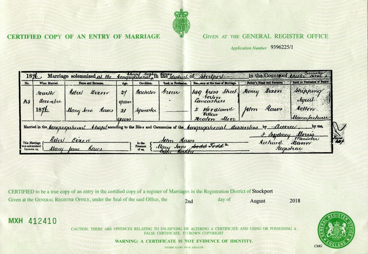 | Marriage | 1876 | Mary Jane Raws & Robert Dixon, Stockport, Lancashire | Goldthorpe | C00109 |