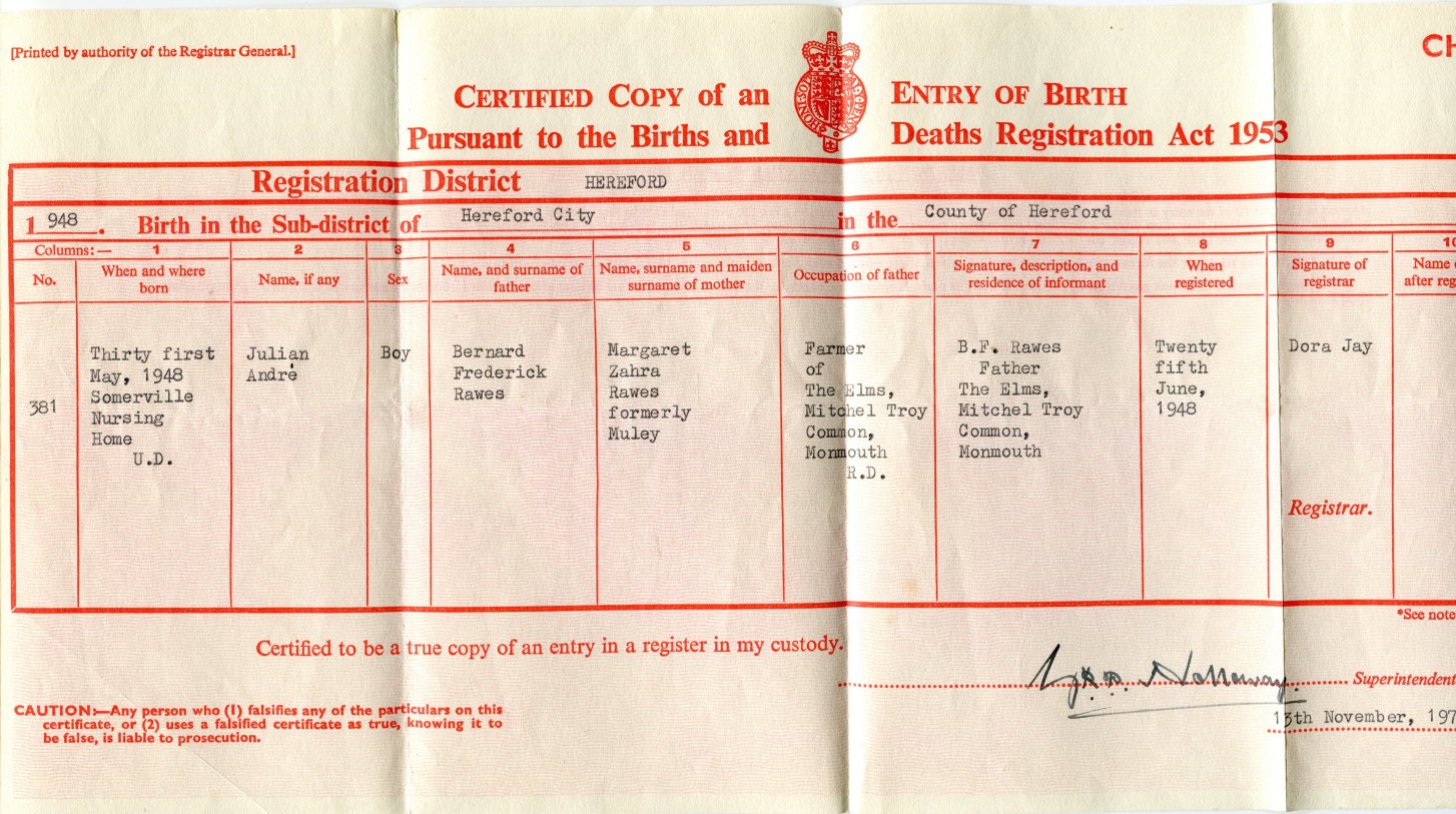 | Birth | 1948 | Julian Andre Rawes of Hereford | Oporto | C00111 |