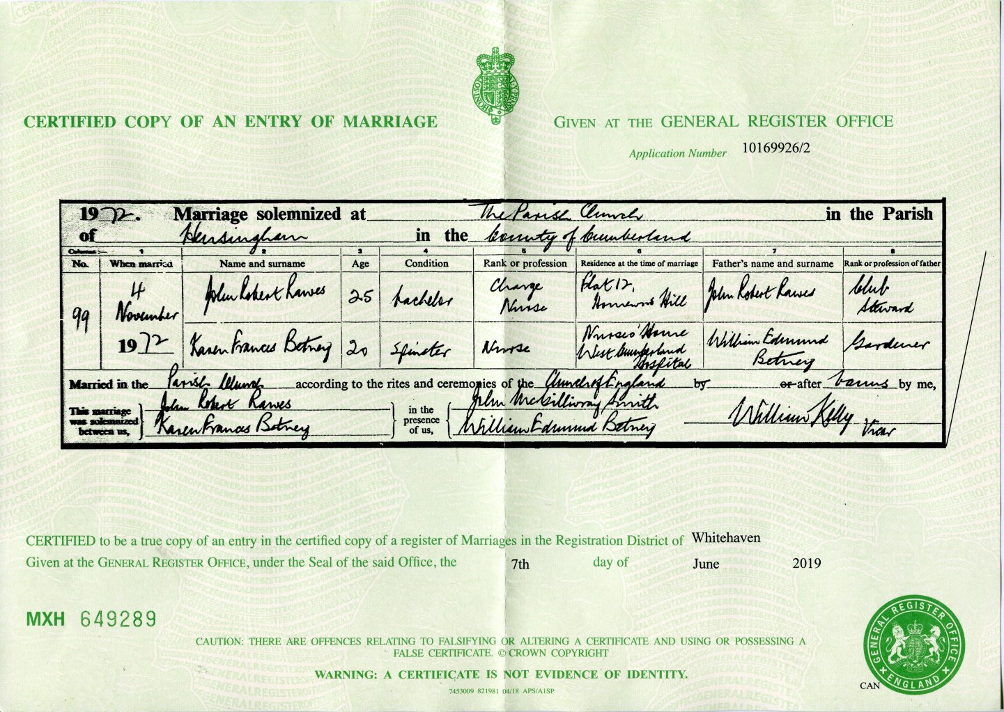 | Death | 1972 | John Robert Rawes of Hensingham, Cumberland | n/r | C00112 |