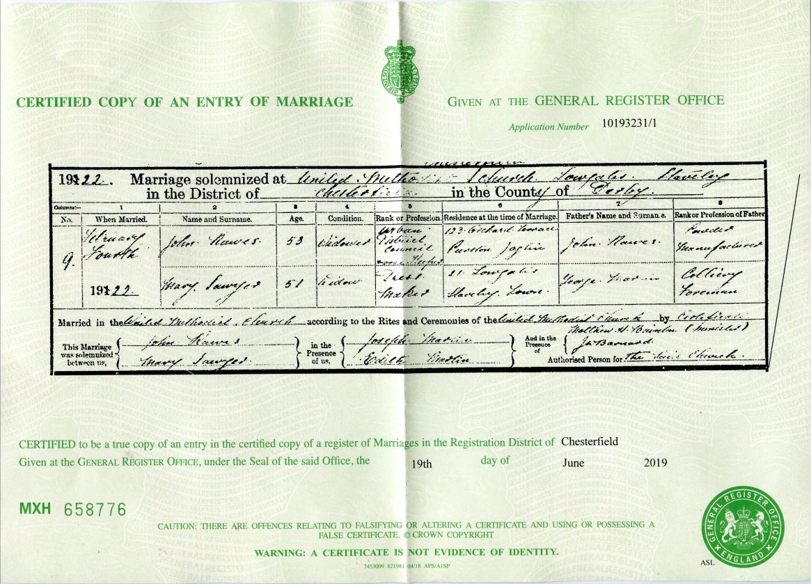 | Marriage | 1922 | John Rawes & Mary Sayler, Chesterfield | Pontefract | C00114 |