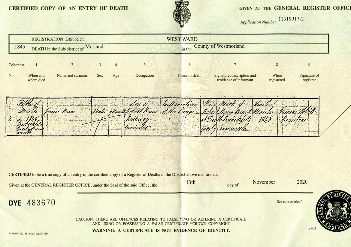 | Death | 1845 | James Raws, Morland, Westmorland, aged 9 months | p/p | C00116 |