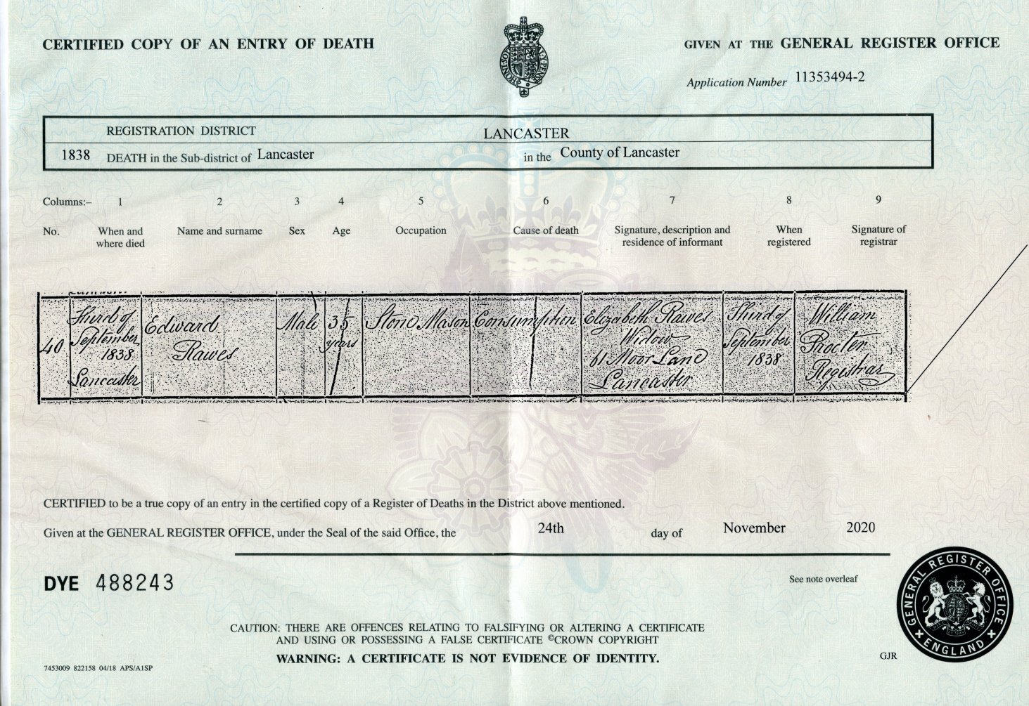 | Death | 1838 | Edward Rawes, Lancester | Heysham | C00118 |