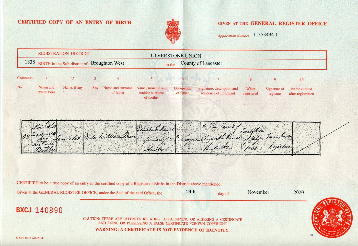 | Birth | 1838 | Lancelot Rawes, Ulverston, Lancashire | Kirkby | C00119 |