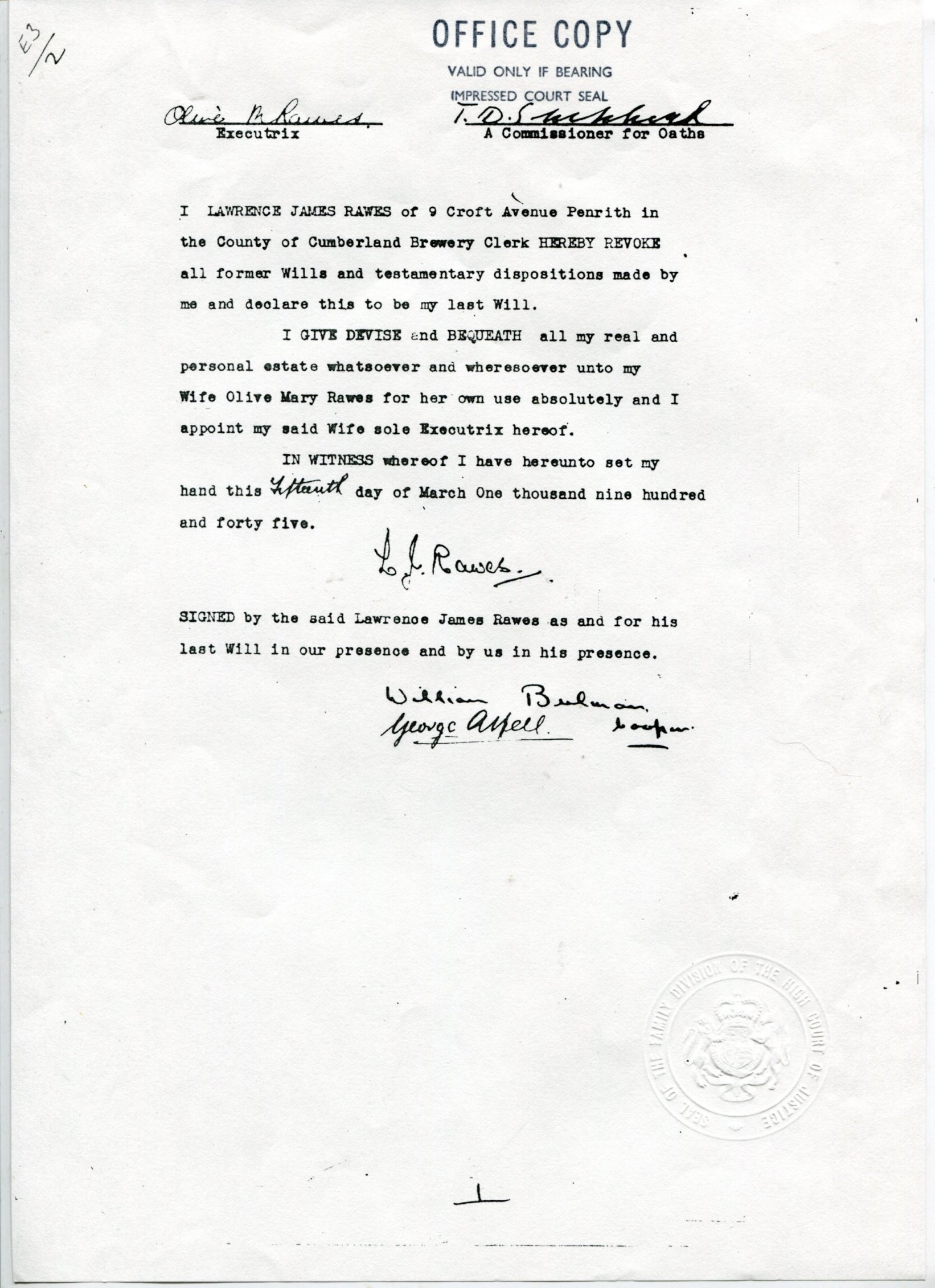 Will of Lawrence James Rawes, of Penrith, Cumberland. Dated 15 March 1945, proved 1960. (Penrith Line)