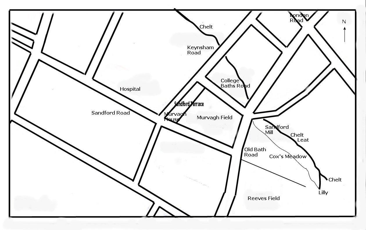 The river Chelt is possibly the main reason for the existence of Cheltenham and is certainly, along with the ancient north south high road, the reason for the existence of ‘Sandford’. The ground on either side of the river rises gently, on the north towards the old Cheltenham high road about a thousand yards away and to the south towards Charlton Park, Sandford fields and the adjacent tithing of Naunton. The Chelt is born on the Cotswold escarpment and flows west for five to six miles until it empties into the river Severn. The river would have originally taken a more meandering and shallower course through the tithing making a small flood plain in a slight valley of sand overlying Lias clay. For most of its course through Sandford the river has been leated or straightened to cater for Sandford and Cambray (Barretts or Cheltenham Mill) Mills. The river would probably have been leated before 1086 when the Domesday Book mentions five mills of which Sandford and Cambray are believed to be two. The Domesday Book appears to indicate that there were two mills in 1066 and five mills by 1086. The modern river course enters the Sandford area about a quarter of a mile to the east at the eastern end of Cox’s Meadow. It flows to the north of the Meadow, past Sandford Mill, under Sandford Bridge or culvert, to the north of the site of the Great House and Farm, under Keynsham Road and into Sandford Park, acting as the park’s northern boundary, until it reaches the Cambray Mill. For much of this stretch it is leated to the north and slightly higher ground. Cox’s Meadow is an area of land bordered to the north by the Chelt and Mill, to the west by the north-south road (Old Bath Road), to the east by the Lilly Brook and to the south by Reeves field, a sports ground belonging to Cheltenham College. The Lilly now joins the Chelt via a sluice at the eastern end of the meadow. The 50" O/S map shows the united rivers continuing in a meandering fashion for about two hundred yards before heading in a straight line for the Mill. The Chelt’s original course would have been through Cox’s Meadow where the natural lie of the land is lower. The Lilly originally joined the Chelt in Cox’s Meadow. The changing of the course of the Lilly may well have taken place considerably later than that of the Chelt. This course probable continued to be used to carry away excess water during wet seasons. Until a few years ago the old course of one or both rivers could still be detected crossing the meadow in a line towards the site of the old ford. This observation is supported on pre-twentieth century maps. The (OS 1888) map shows the old course enhanced by a line of trees, possibly willows, and the Charlton Park boundary line which at this point meanders across Cox's Meadow in such a way as to indicate the original course of the river. Around 1980, due to the collapse of an old tunnel, a trench was cut in the road near the site of the old ford . The tunnel was aligned in a northwesterly direction between the old river course and the Chelt, and probably once either channelled the old route of the Lilly, or was used to drain excess water from Cox's Meadow. There is also a further leat to take unwanted water from the millpond around the north side of the mill. The present bridge is almost certainly to the north of the original Ford. After the bridge, the river continues a meandering course to the north of the present College Baths and Fire Station. The area between the river and the settlement was called Sandford Dread, probably denoting wet or boggy ground. The deep depression alongside College Baths Road, noticed during the development of Murvagh Field, may have been an attempt to isolate the settlement from this marshy area or perhaps may even be an original course of the river. After flowing under Keynsham Road, the river enters Sandford Park where it acts as the park’s northern boundary. Again however the lie of the land suggests the river’s original course lay somewhere through the centre of the Park. About a hundred yards into the Park, the river turns slightly to the south and then to the north west. It is possible that this indicates where the leat for the Cambray Mill starts. The southern boundary of Sandford Park may also echo the river’s meandering course. It must be emphasised that even the unleated stretches, which apparently follow the Chelt's original course, would have been altered almost beyond recognition by deepening, and the raising of banks. The river would originally have been much wider and shallower than now with wide tracts of meadow lands either side. In the nineteenth century two serious floods took place. One in 1830 and another on Thursday the 26th of July 1855, graphically described by 'Goding' (p608) “after many hours of heavy rain a culvert at the upper mill in Charlton Kings burst and a virtual tidal wave swept down through Sandford, Bath Road, Rodney Road, Regent Street, The Promenade, Royal Well and Jessops Nursery, and on to Alstone. An area up to two hundred yards wide was affected.” Although small, the river's unpredictable nature over the centuries posed a natural barrier to the southward expansion of Cheltenham.
