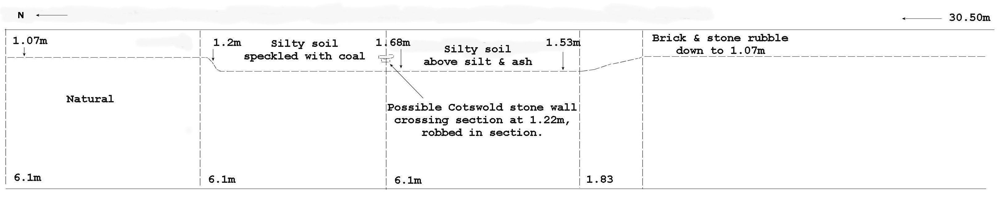 Two cross sections were recorded, in trenches of a house foundation alongside College Baths Road (14m to the north) and opposite the entrance to the Fire station depot and numbered 2 on Fig: 1a:-