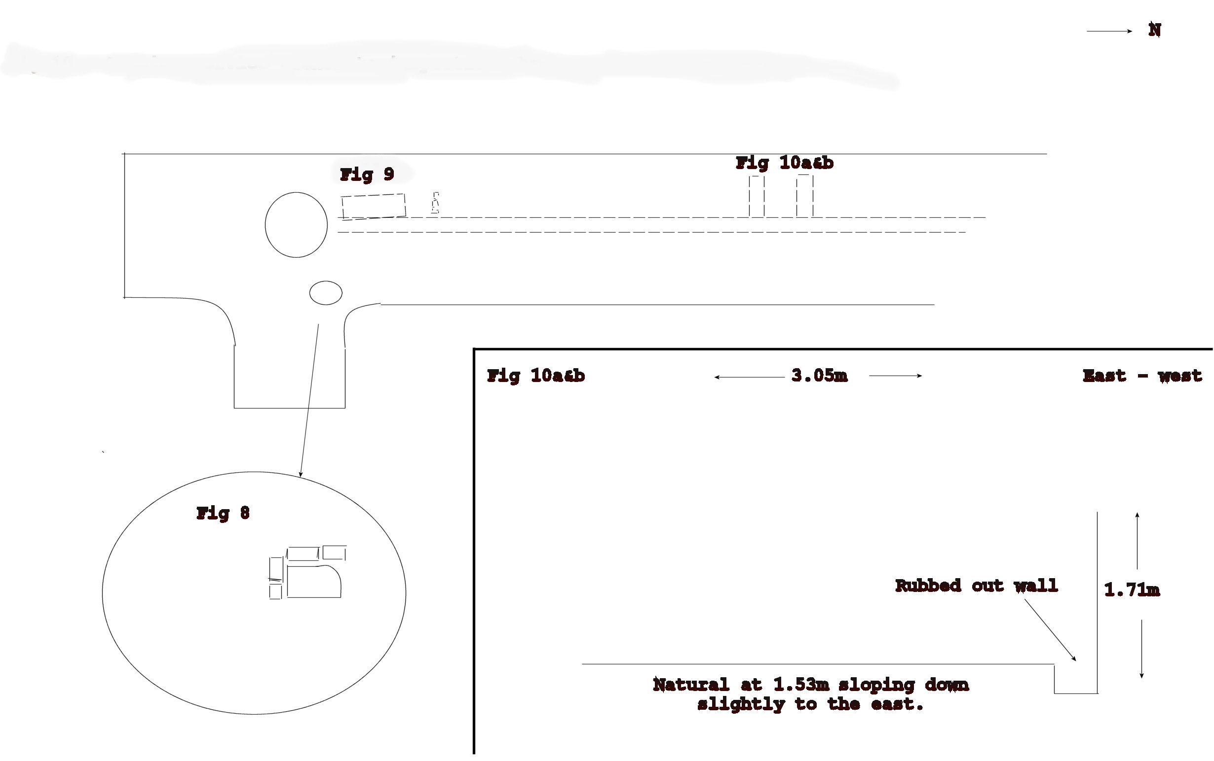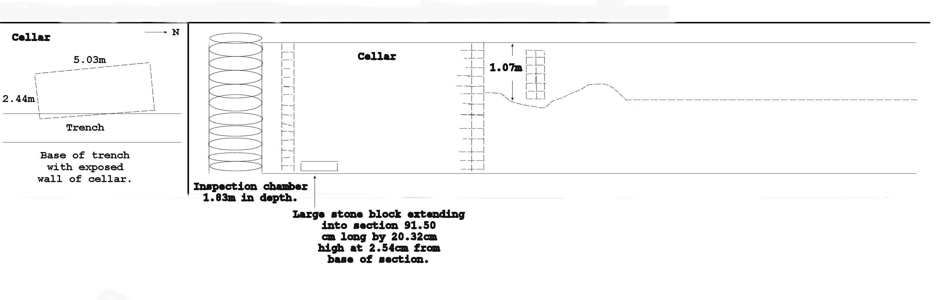 ![]() Fig 9: Inspection chamber, cellar and wall exposed in the western section of the service trench. Also indicated in Fig: 9, was what appeared to be the foundations of a stone wall set in a depression of the natural. The structure disappeared into the section 91.44cm from the cellar set at a north easterly angle. The wall did not appear in the eastern section of the same trench, which showed natural at 91.50cm.
