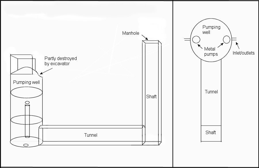 Foundation trenches about 4.50m from the edge of College Baths Road revealed part of a long disused water pumping system installed to supply the College Baths. The Baths were built in the 1880’s. The section of the system exposed was of a large circular brick construction 2.13m high by 1.52 across, with inlet and outlet pipes entering at either side, just above two decorative cast-iron circular cylinders standing about 120cm high by 38cm in circumference (fig 11). A metre or two to the west was a square brick shaft capped by a metal manhole cover with a tunnel connecting with the circular construction. An extension to this system was revealed further into the field under the southern edge of the new access road and nearer to a probable pumping house that existed on the site in the early 20th century. The assumed pumping house was erected further into the field alongside a short road that was cut through the site in the 1880s'. House foundation trenches sliced through the area where this pumping house had been, and exposed rubble trenches sitting on a 90 to 120cm-deep silty soil in which a boars tusk was found. The pumping house and system appear to have been abandoned by about 1920. From observations on the ground, a parallel system appears to exist in the grounds of the College baths, approximately 3m from the edge of College Baths Road.