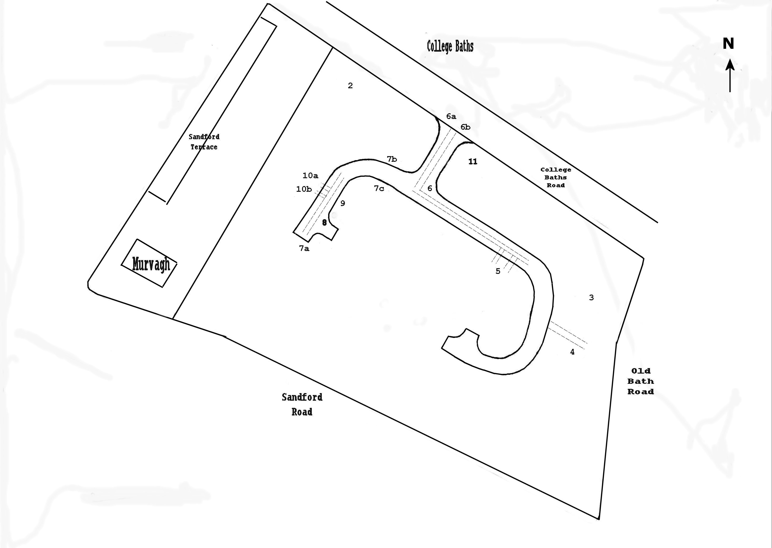 ![]() Fig 1: The site of Murvagh Field in the Sandford Area, Cheltenham. The ‘field’, along with the land occupied by Sandford terrace and Murvagh house, was once part of an ancient country estate known as Sandford. The settlement was swept away and forgotten during the 19th century. Sandford house was demolished in the 1830’s to be replaced by a ‘Gothic Villa’, which was itself pulled down in the 1880’s. (1). The farm, along with a cottage and outbuildings, was demolished after the Cheltenham Boys College purchased the land in 1894. The map of Cheltenham published by H S Merrett in 1834 was the first to illustrate Sandford in fine detail. The map details the Manor house in the north west corner divided by a property line which remained long after the house was demolished to become the present access lane for Sandford Terrace. The newly built Gothic Villa to the north east, Sandford Farm and cottage, along with a number of outbuildings, and it also depicts the present ‘Murvagh’ House, bordering Sandford Road and built in 1810/1.