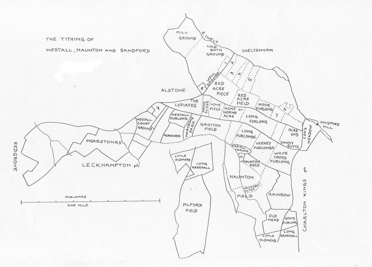 ![]() In 1988, Barbara Rawes wrote an article on the field names of the Hundred of Cheltenham. One of the plans produced was of the fields that made up the tithing of Westall, Naunton and Sandford at around 1750 (Cheltenham LHS, Jnl.6.). The plan identifies the Mill and Cox’s meadow. Looking closer one can see the predecessor of Sandford Road dividing Moor Furlong from Long Furlong. The predecessor of Thirlestone divides Sandy Butts and White Cross Furlong. The name White Cross survives as Whitecross Square.