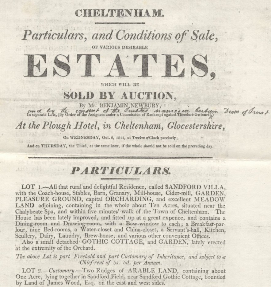 The Sandford Estate or Great House was sold by auction on 2nd October 1811. The advertisement in the Cheltenham Chronicle and the sale particulars survive.